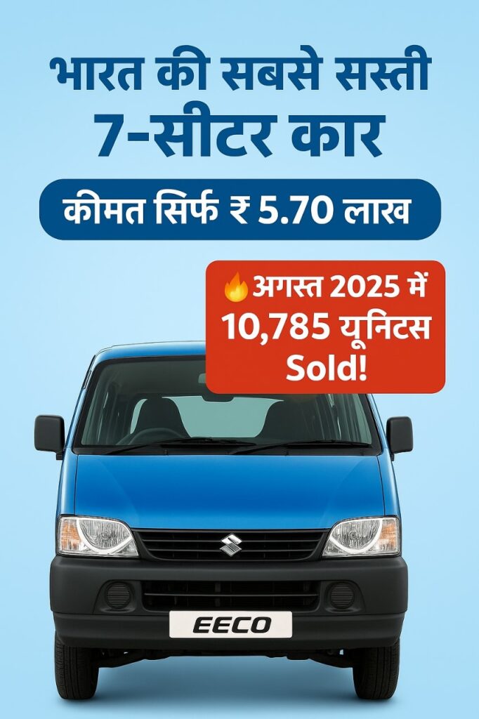 “देश की सबसे सस्ती 7-सीटर कार Maruti Suzuki Eeco ने अगस्त 2025 में 10,785 यूनिट्स बेचकर रिकॉर्ड बनाया। जानें कीमत, माइलेज और फीचर्स की पूरी जानकारी।”