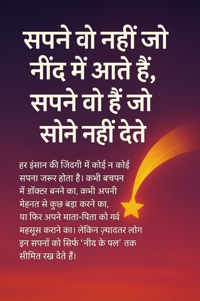 “सपने वो नहीं जो नींद में आते हैं, सपने वो हैं जो सोने नहीं देते” – इस प्रेरणादायक लेख में जानिए कैसे सच्चे सपनों को मेहनत, जुनून और विश्वास से साकार किया जा सकता है।